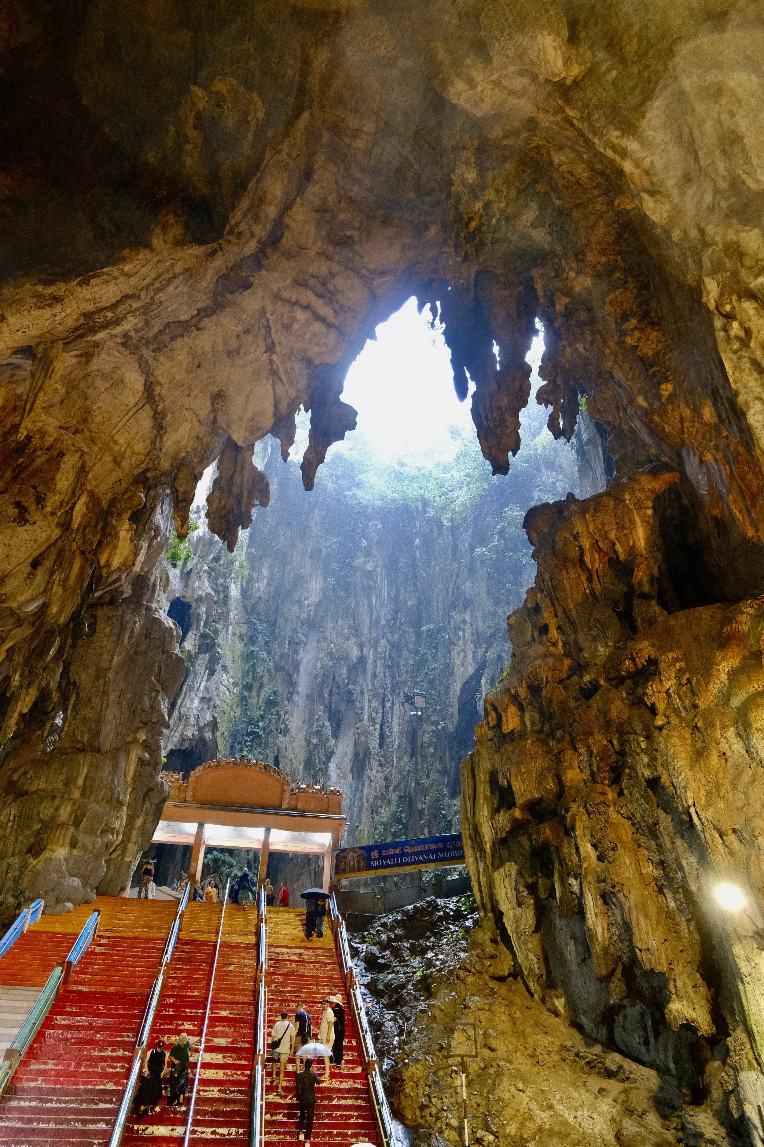 Even though it rained, we climbed all 272 steps to the top. The stairs were full of monkeys, and I forced myself to ignore my fear. At the top, a fantastic view waited for us, and inside the cave a vast, echoing space opened above us, with temples and shafts of daylight falling through the ceiling.
