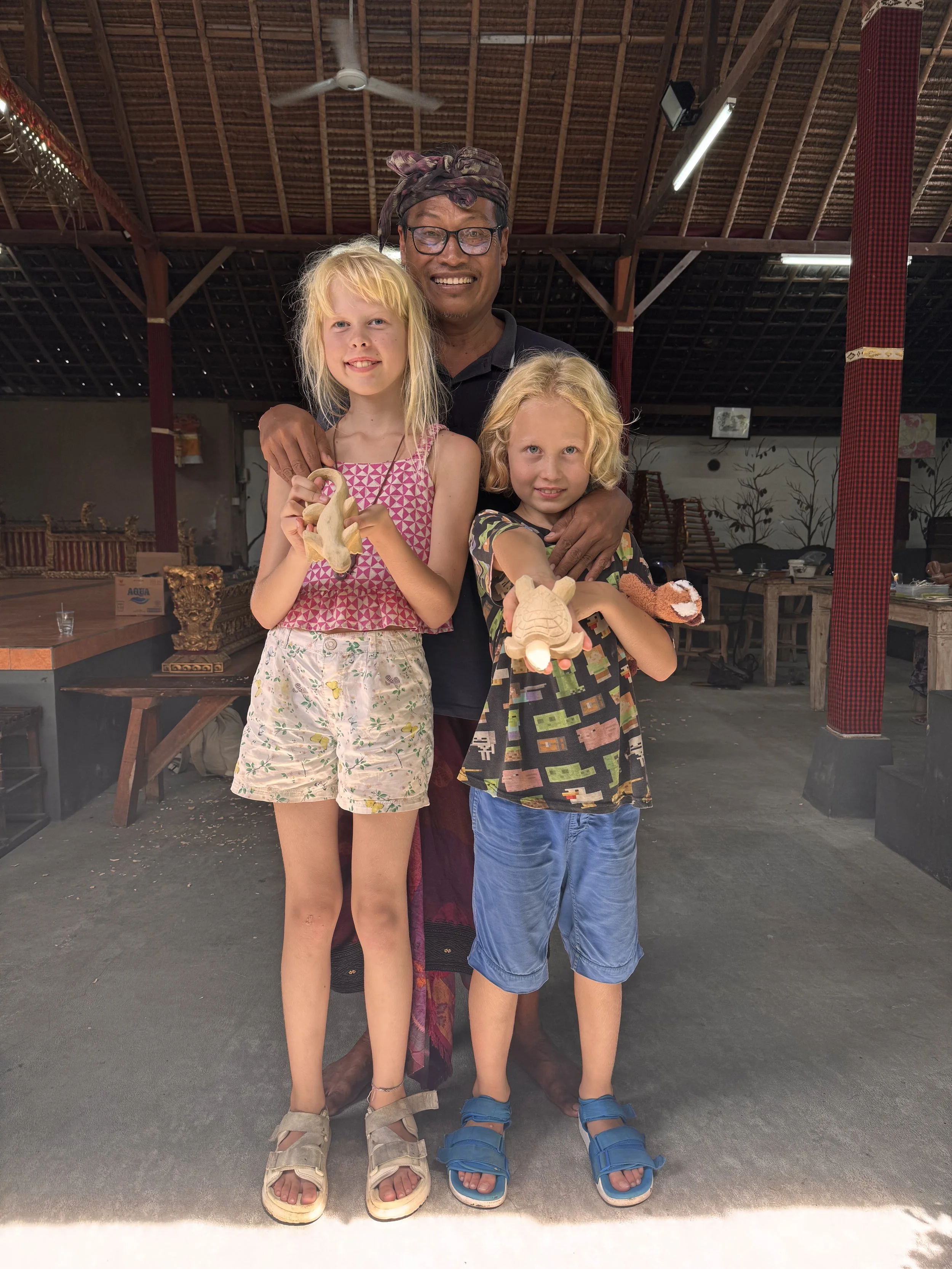 At a small library in Ubud we joined a wood-carving workshop. Our teacher was an older man who clearly loved children. He came from generations of carvers, and everything around us had been made by his family. Masks, panels, instruments. Traditional Balinese instruments — gamelan pieces, kendang drums, bamboo flutes — all decorated with carvings.
