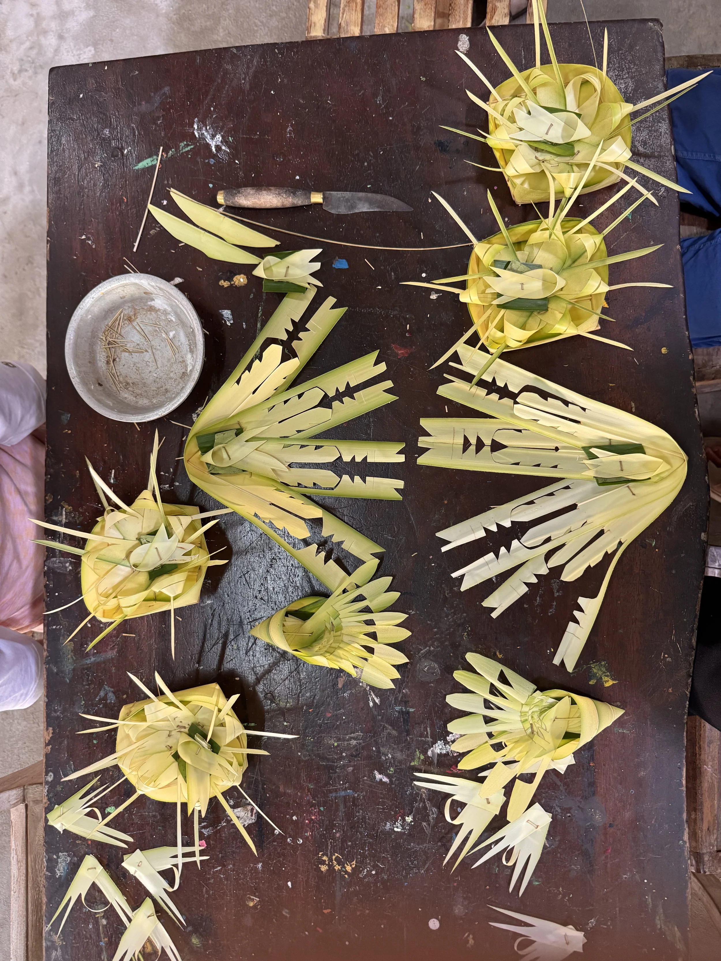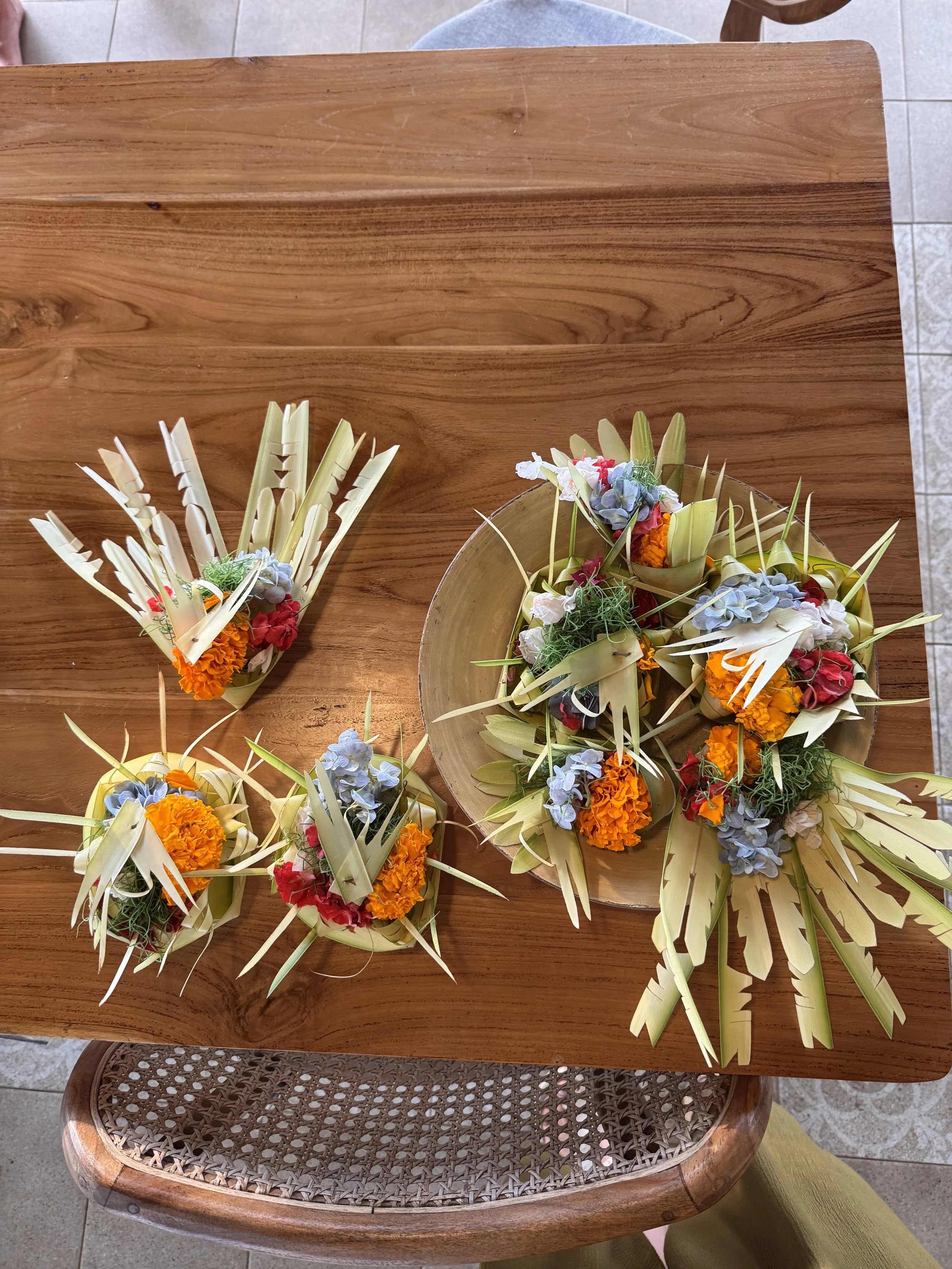 The next day we returned to learn about the small offerings placed everywhere. A woman and her grandmother taught us how to weave canang sari from banana leaves and bamboo. We learned what each element meant — flowers for the directions and the gods, rice for life, incense carrying prayers upward, small treats representing balance. It wasn’t complicated, but it felt meaningful. The kids took it very seriously.